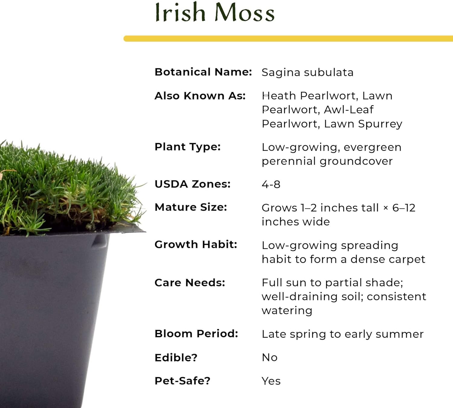 - READY TO PLANT: Includes 6 Irish Moss live starter plants (Sagina subulata) in 2.5-inch nursery cubes, fully rooted and ready for your rock gardens, pathways, or groundcover beds. Also known as Heath Pearlwort, Lawn Pearlwort, Awl-Leaf Pearlwort, and Lawn Spurrey.