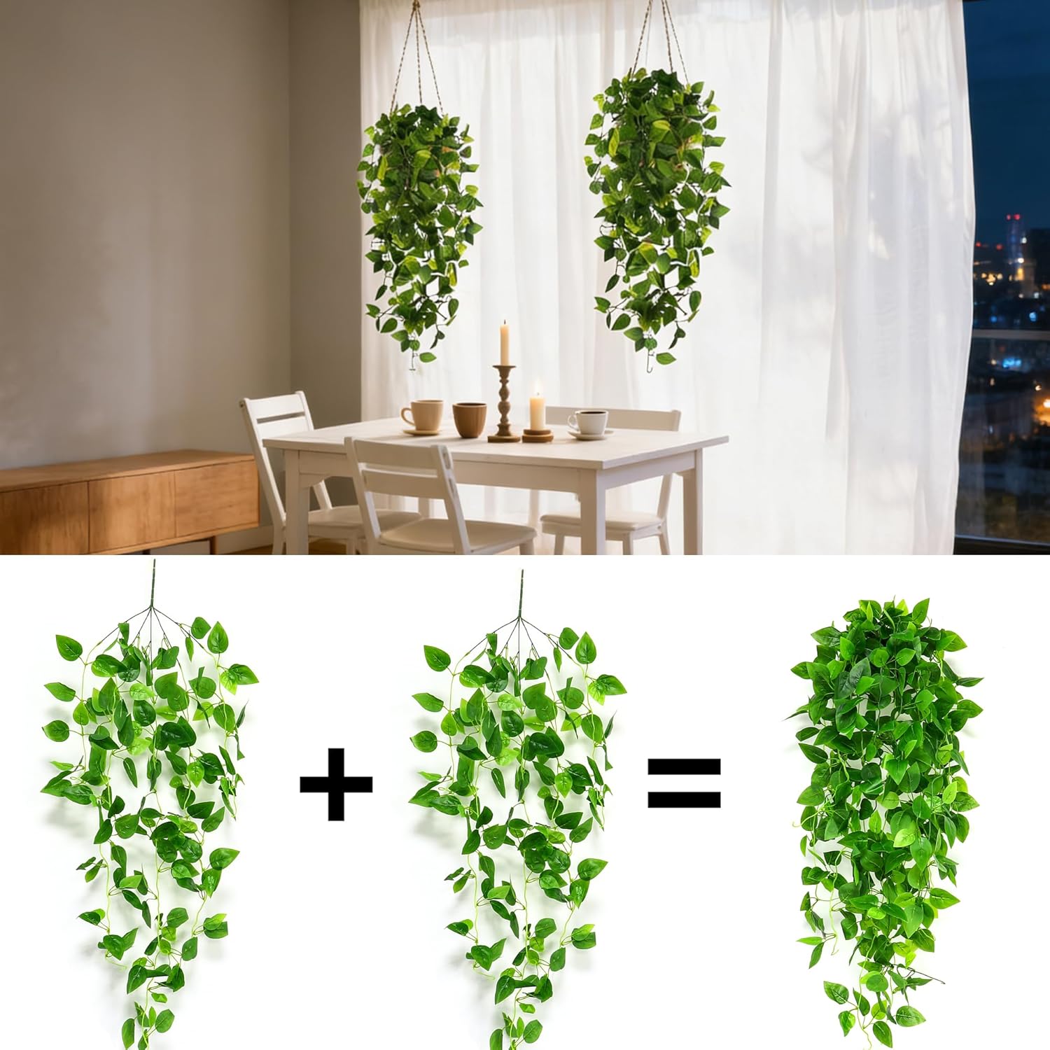 - Excellent Quality:The leaves of fake hanging plants vine are made of shigh quality fabric with a glue-filtered surface and the stems are made of premium plastic and iron wire that is waterproof and durable. The lifelike appearance is more realistic and natural. The fresh green color has a natural tint, giving an elegant look that's perfect for both indoor and outdoor decoration.